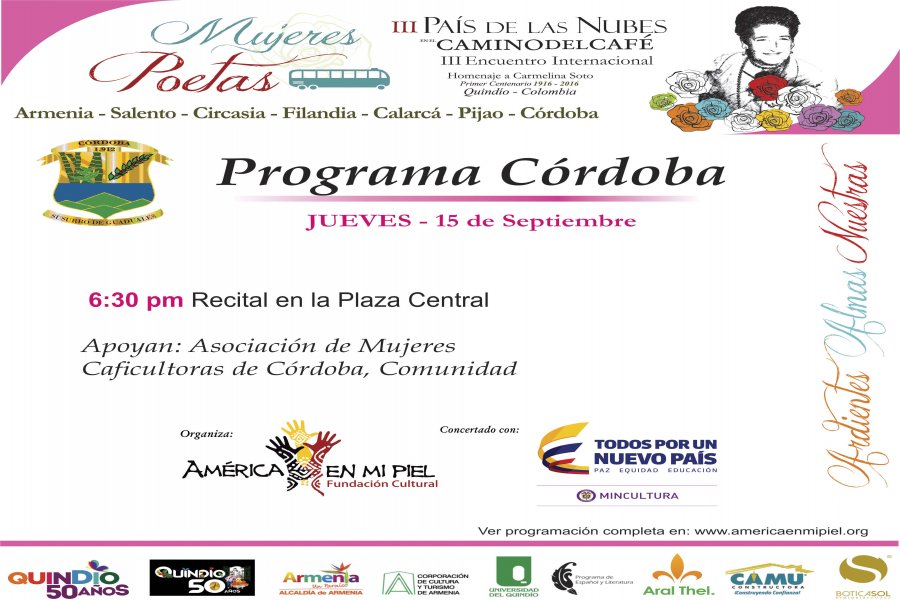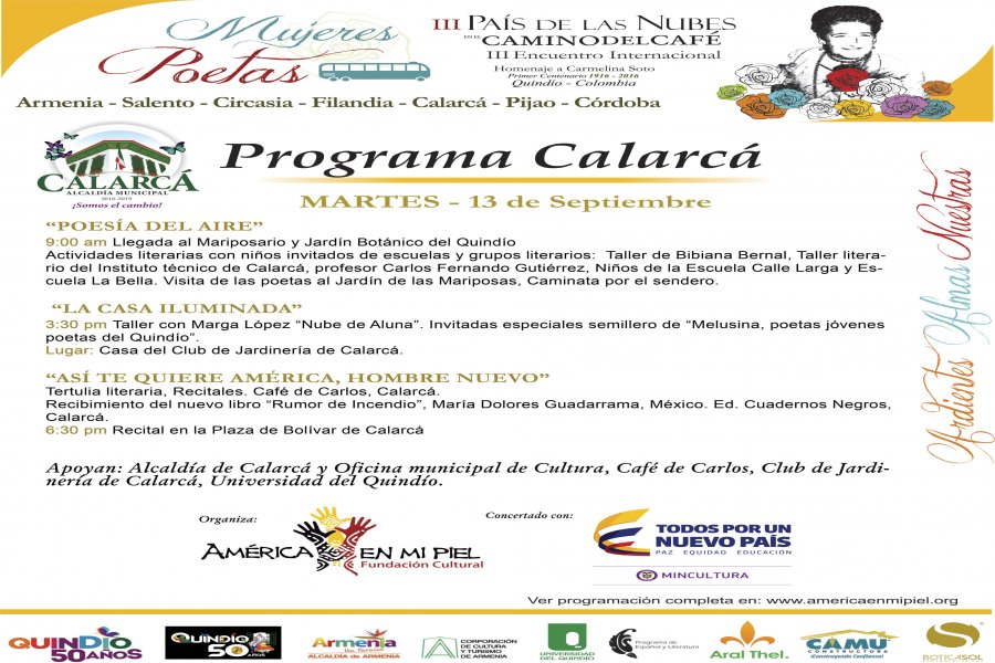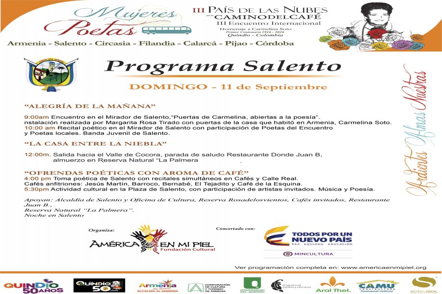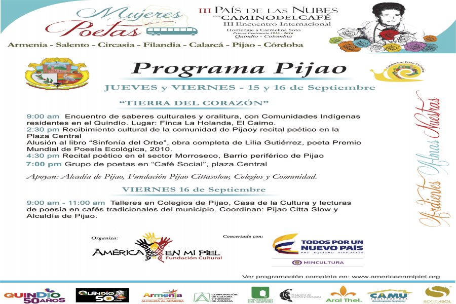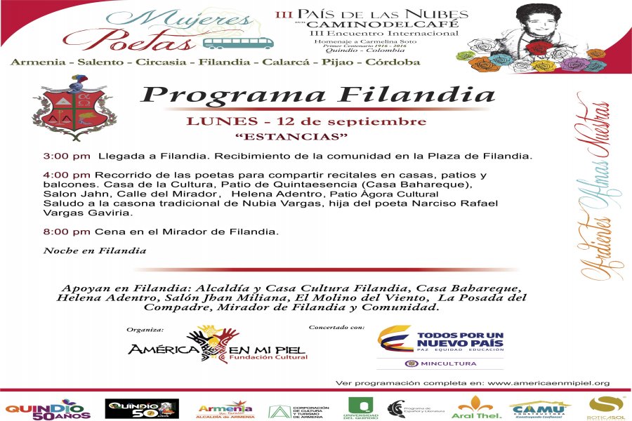 Así será la programación del III Encuentro de Mujeres Poetas Pais de las Nubes en el Camino del Café por los diferentes municipios del departamento del Quindío, invitación a todos los ciudadanos para que se unan a estos escenarios tan importantes. Sean todos bienvenidos.